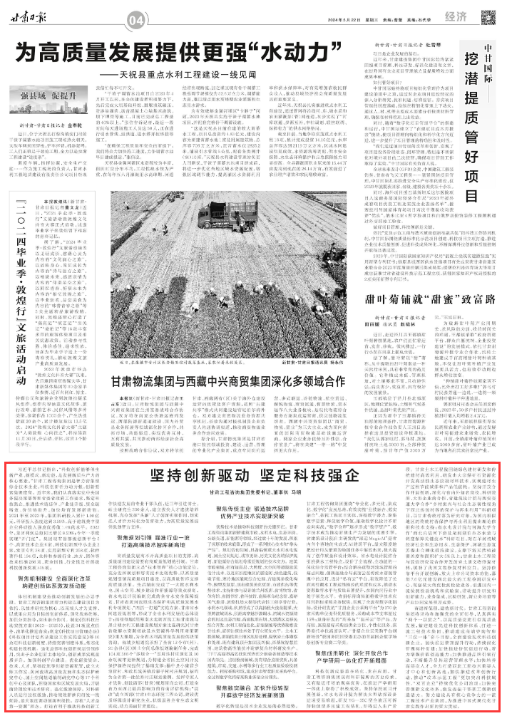 科技創(chuàng)新成果重在轉(zhuǎn)化、貴在應(yīng)用。甘肅工程咨詢集團既有科研院所的歷史傳承,又有貼近市場的現(xiàn)實優(yōu)勢,在推進產(chǎn)學(xué)研用一體化上取得了積極成效。堅持依托項目開展創(chuàng)新,省水電設(shè)計院為解決大型鉆探設(shè)備進場受限難題,研發(fā)YG—35C型全液壓可拆卸輕便型多用途工程鉆機,即將進入生產(chǎn)階段。甘肅土木工程院圍繞綠色建材研發(fā)和傳統(tǒng)建材高效利用,研發(fā)出大宗煤矸石資源化開發(fā)高活性生態(tài)膠凝材料技術(shù),實現(xiàn)建材生產(chǎn)過程節(jié)能減排和產(chǎn)品低能耗。堅持開放合作開展創(chuàng)新,深化與省內(nèi)外知名高校、科研院所、大型企業(yè)的合作,省建筑設(shè)計院與西安交通大學(xué)合作“鄉(xiāng)村振興與社會生態(tài)韌性視角下西北傳統(tǒng)村落的保護與再生利用”科研項目,以甘肅傳統(tǒng)村落為研究對象,為國內(nèi)相似地區(qū)的傳統(tǒng)村落保護與再生利用提出理論依據(jù)和技術(shù)支持;省水電設(shè)計院與河海大學(xué)合作“西北內(nèi)陸河下游及尾閭湖泊生態(tài)水量與調(diào)度保障關(guān)鍵技術(shù)”科研項目,對石羊河流域經(jīng)濟社會和生態(tài)用水、生態(tài)保護、河湖生態(tài)復(fù)蘇提出合理化措施建議,支撐下游天然植被覆蓋度和面積擴大5%以上;甘肅土木工程院與敦煌研究院合作開發(fā)的巖土質(zhì)文物修復(fù)材料,填補了我國文物修復(fù)材料空白。堅持依靠平臺開展創(chuàng)新,放大上市公司資本功能,募集7.6億元建設(shè)西北最大的工程檢測研發(fā)中心,做強做大做優(yōu)檢測檢驗業(yè)務(wù),引進國內(nèi)一流檢測檢驗機構(gòu)和實驗室,帶動提升研發(fā)和創(chuàng)新能力,業(yè)務(wù)集成、試驗研發(fā)、新業(yè)務(wù)培育等產(chǎn)業(yè)協(xié)同發(fā)展積厚成勢。