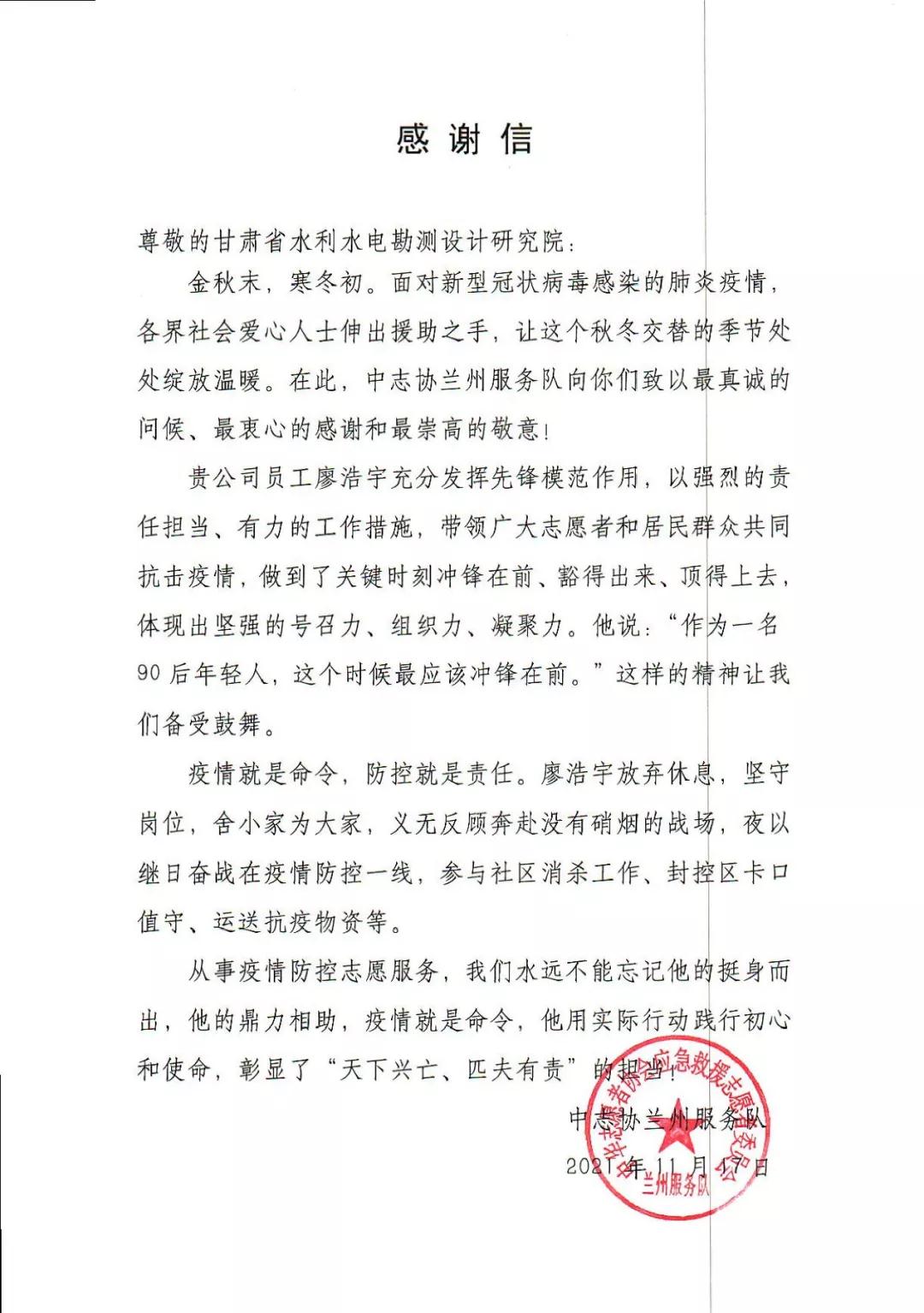 近日,水電設(shè)計院收到中志協(xié)蘭州服務(wù)隊和團(tuán)結(jié)新村街道天平街社區(qū)發(fā)來的感謝信。信中對水電設(shè)計院規(guī)劃院員工廖浩宇在此次疫情發(fā)生后,主動請纓參加疫情防控服務(wù)工作,甘當(dāng)疫情防控最美逆行者,持續(xù)堅持26天志愿者服務(wù)的先進(jìn)事跡表示感謝。