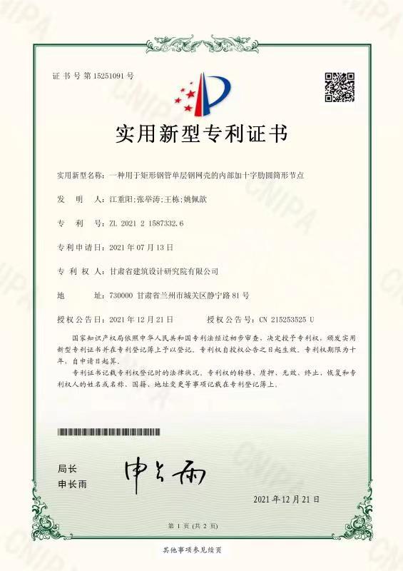 近日,從國家知識產(chǎn)權(quán)局傳來好消息,由建筑設(shè)計院總工程師張舉濤、設(shè)計四所總工程師江重陽、設(shè)計五院總工程師王棟、設(shè)計四所工程師姚佩歆聯(lián)合申報的“一種用于矩形鋼管單層鋼網(wǎng)殼的內(nèi)部加十字肋圓筒形節(jié)點”技術(shù),喜獲國家實用新型專利。