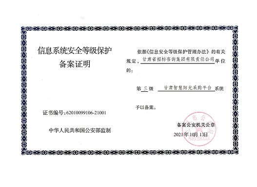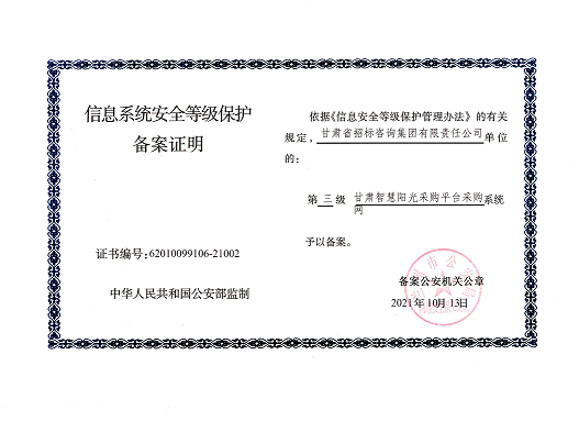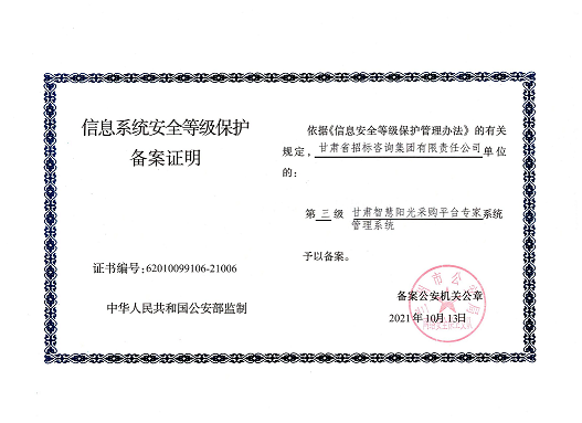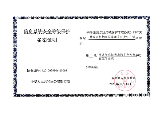 近日,由招標(biāo)咨詢集團(tuán)負(fù)責(zé)開發(fā)建設(shè)的甘肅智慧陽光采購(gòu)平臺(tái)系統(tǒng),以及甘肅智慧陽光采購(gòu)平臺(tái)采購(gòu)網(wǎng)系統(tǒng)、大數(shù)據(jù)監(jiān)管系統(tǒng)、招標(biāo)系統(tǒng)、保證金系統(tǒng)、專家管理系統(tǒng)通過國(guó)家三級(jí)等保認(rèn)證,系統(tǒng)管理安全能力獲得業(yè)界最高標(biāo)準(zhǔn)。
