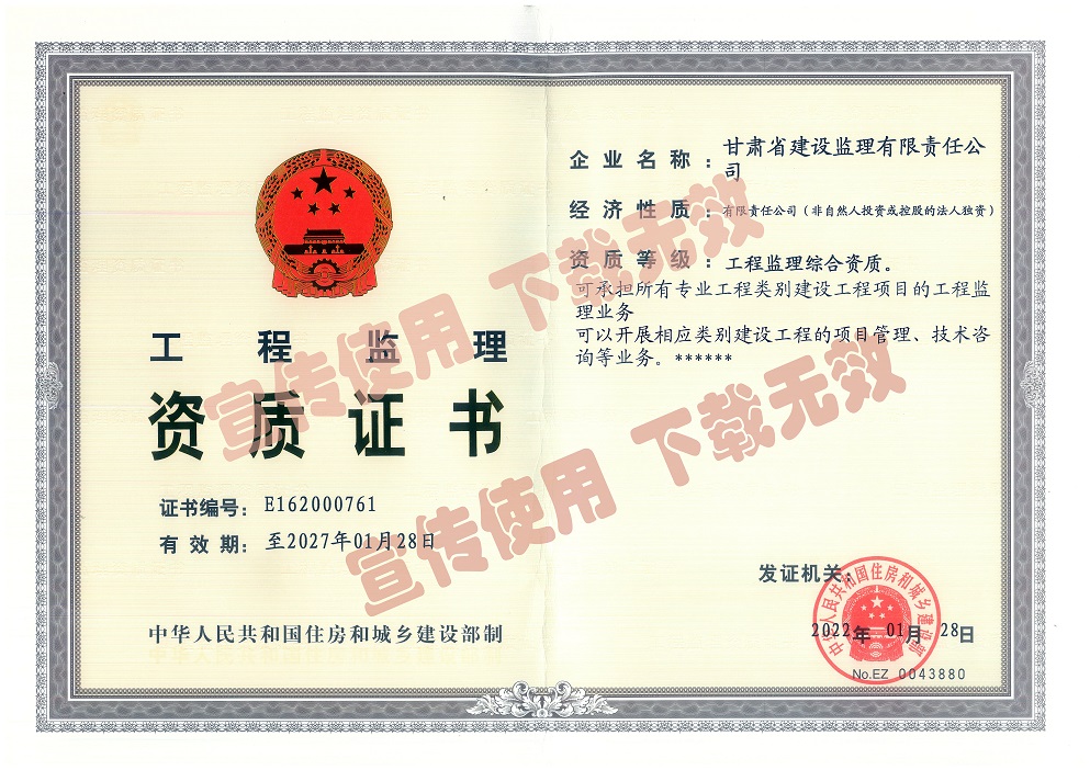 千淘萬漉雖辛苦,吹盡黃沙始到金。2月17日,甘肅省建設監(jiān)理有限責任公司正式取得工程監(jiān)理綜合資質,成為甘肅省本土唯一擁有綜合資質的監(jiān)理企業(yè)。