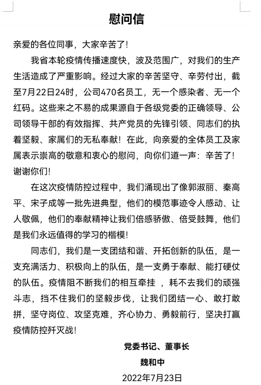 近日,甘肅省建設(shè)監(jiān)理有限責(zé)任公司黨委書(shū)記、董事長(zhǎng)魏和中向全體職工發(fā)出慰問(wèn)信,對(duì)在疫情期間值守項(xiàng)目一線和抗戰(zhàn)疫情一線的黨員干部職工致以最誠(chéng)摯的關(guān)心和感謝。同時(shí),號(hào)召全體干部職工向疫情防控期間涌現(xiàn)出的一線先進(jìn)典型個(gè)人和共產(chǎn)黨員先鋒者學(xué)習(xí),團(tuán)結(jié)一心、敢打敢拼,堅(jiān)守崗位、攻堅(jiān)克難,齊心協(xié)力、勇毅前行,堅(jiān)決打贏疫情防控殲滅戰(zhàn)。