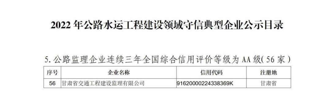 近日,交通運輸部公布了《關(guān)于2022年公路水運工程建設(shè)領(lǐng)域守信典型企業(yè)目錄的公示》對獲評公路水運工程建設(shè)領(lǐng)域守信典型的93家設(shè)計企業(yè)、93家施工企業(yè)、56家監(jiān)理企業(yè)予以公示。甘肅省6家企業(yè)榜上有名,甘肅省交通工程建設(shè)監(jiān)理有限公司是我省唯一一家上榜的監(jiān)理企業(yè)。