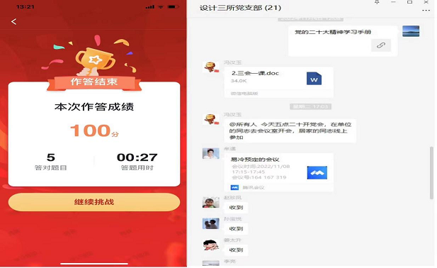 以賽促學(xué),強技礪能精研細琢。各黨支部組織黨員通過學(xué)習(xí)強國“黨的二十大精神答題活動”“黨的二十大精神應(yīng)知應(yīng)會百題”等形式,開展線上答題競賽,全面檢驗黨員干部對黨的二十大報告內(nèi)容的掌握程度,進一步增強黨員干部對學(xué)習(xí)黨的二十大精神的認識和重視,推動黨的二十大精神入腦入心,鞏固提升學(xué)習(xí)效果,以賽促學(xué)、以知促行,用黨的二十大精神武裝頭腦、指導(dǎo)實踐、推動工作。