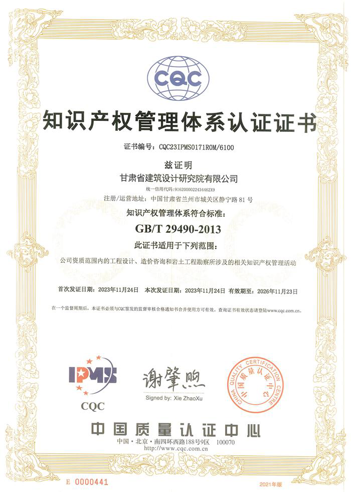 近日,省建筑設(shè)計(jì)院收到由中國質(zhì)量認(rèn)證中心頒發(fā)的編號為CQC23IPMS0171ROM/6100的《知識產(chǎn)權(quán)管理體系認(rèn)證證書》,標(biāo)志著省建筑設(shè)計(jì)院知識產(chǎn)權(quán)管理體系完全符合GB/T 29490-2013標(biāo)準(zhǔn),這是省建筑設(shè)計(jì)院在國家層面知識產(chǎn)權(quán)領(lǐng)域取得的重要認(rèn)可,進(jìn)一步提升了省建筑設(shè)計(jì)院的綜合競爭力。
