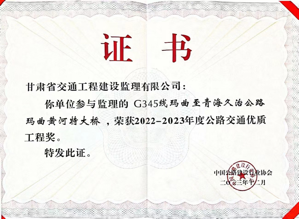 近日,中國(guó)公路建設(shè)行業(yè)協(xié)會(huì)于湖北武漢召開(kāi)第五屆公路建設(shè)高質(zhì)量大會(huì)暨2022-2023年度公路交通優(yōu)質(zhì)工程獎(jiǎng)表彰大會(huì)。省交通監(jiān)理公司“代建+監(jiān)理”的G345線(xiàn)瑪曲至青海久治公路瑪曲黃河特大橋榮獲公路交通優(yōu)質(zhì)工程獎(jiǎng)。此次獲獎(jiǎng)系公司在兩徽、金阿高速公路之后第三次獲得全國(guó)公路交通優(yōu)質(zhì)工程獎(jiǎng)——李春獎(jiǎng)。
