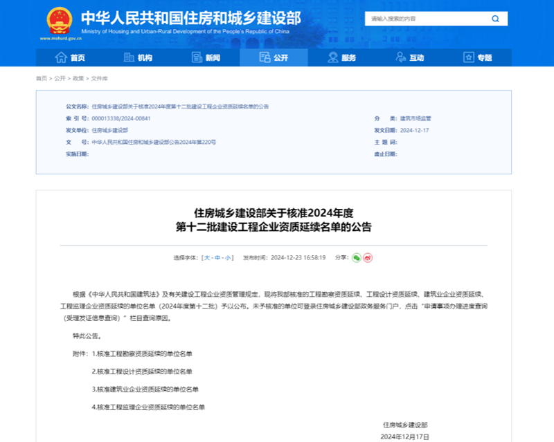 近日,住房城鄉(xiāng)建設(shè)部正式發(fā)布了《關(guān)于核準(zhǔn)2024年度第十二批建設(shè)工程企業(yè)資質(zhì)延續(xù)名單的公告》。省建筑設(shè)計院建筑行業(yè)甲級、風(fēng)景園林工程設(shè)計專項甲級、市政行業(yè)(給水工程)專業(yè)甲級、市政行業(yè)(熱力工程)專業(yè)甲級資質(zhì)通過核準(zhǔn)延續(xù)。